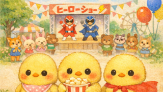 ひよこものがたり [ひよこものがたり]第63話ヒヨコ三兄弟、ヒーローショーへ行く! 今日は町の広場で、大人気ヒーロー「ピカピカ戦隊フワレンジャー」のショーがある日!ヒヨコ三兄弟は朝からソワソワ、ウキウキです。「ボク、フワレッドになるピヨ!!」朝ごはんを食べながら、ヒヨコくんはすでに戦闘モード。ぴもんくんは「ボクはフワブルー... 2026.01.14 ひよこものがたり