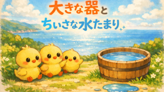 ひよこものがたり [ひよこものがたり]ことばのおくりもの第26話「大きな器とちいさな水たまり」 ある朝、ヒヨコくんたちは丘の上の見晴らし台へと出かけました。遠くまで続く青い空と、きらきら光る海を見て、ぴもんくんがぽつりと言いました。「ボクたちのお庭の池なんて、海にくらべたらちっちゃいピヨねぇ〜」「でもボク、あの池が大好きピヨ!」とひよ... 2026.02.12 ひよこものがたり
