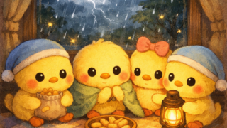 ひよこものがたり [ひよこものがたり]言葉の贈り物編第27話「嵐の夜のひかり」 その夜、アニマルランドに大きな嵐がやってきました。風が森の木々を揺らし、雨がトントンと窓を叩きます。ヒヨコくんは、おうちの中で毛布にくるまりながら外を見つめていました。「こわいピヨ……。早く朝にならないピヨ……?」すると、ドアの向こうから小... 2026.02.15 ひよこものがたり