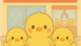 ヒヨコ三兄弟はわくわく顔で、ぴょんぴょん飛び跳ねます。