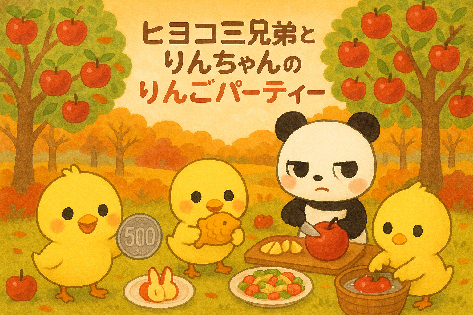 ある秋の晴れた日、森の奥にあるりんご園にヒヨコ三兄弟とパンダのりんちゃんがやってきました。