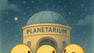 ある日の午後、ヒヨコ三兄弟は町に新しくできたプラネタリウムにやってきました。入口でチケットを受け取ると、天井の高いドームの中へ案内されます。座席はふかふかで、まるで雲の上に座っているようでした。「わぁ〜、すごいピヨ!」とヒヨコくんは最初、は...