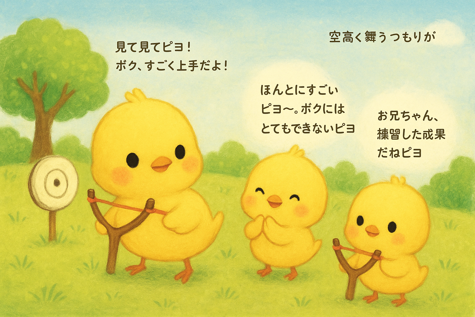「見て見てピヨ! ボク、すごく上手だよ!」