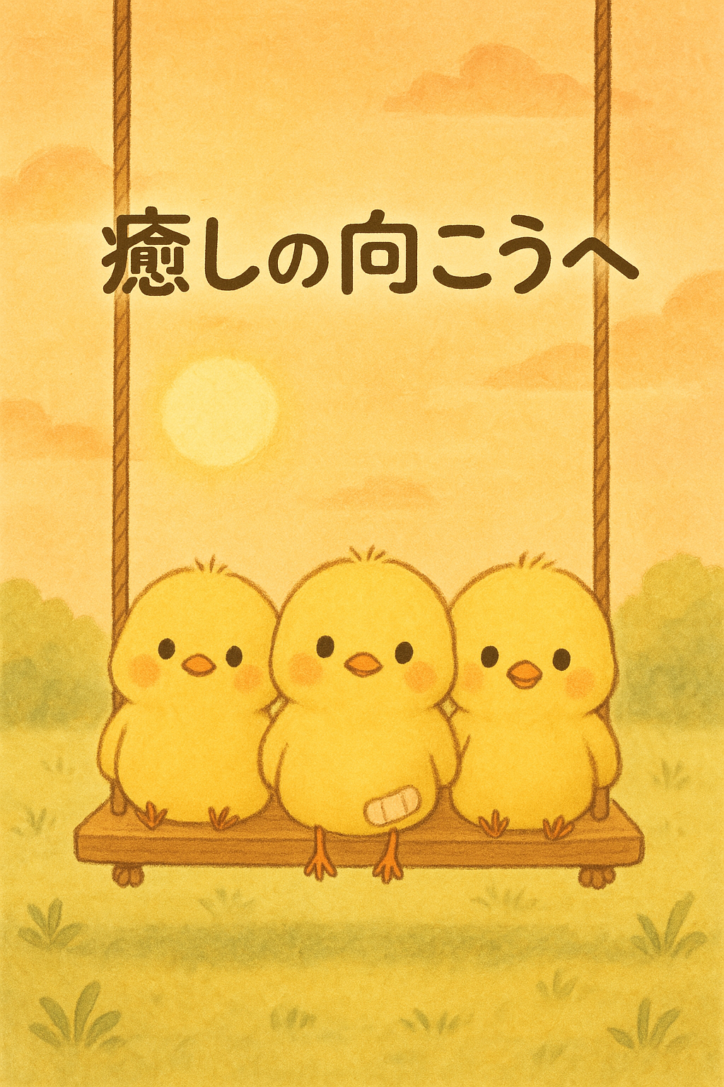 ある日の夕暮れ、ヒヨコ三兄弟は庭のブランコに並んで座っていました。