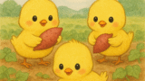 ある日の午後、ヒヨコ三兄弟が庭で遊んでいると、ヒヨコくんが突然大きな声を出しました。
