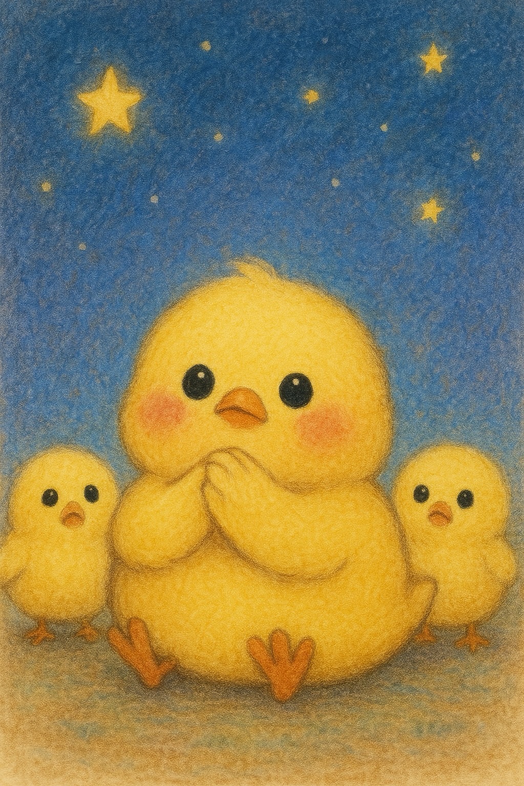 ※タイトルのイラストには、星空に願うぴもんくんが描かれています。ぺたんと座って両手を合わせてお祈りしています。後ろにはヒヨコくんとひよたくんもいます。