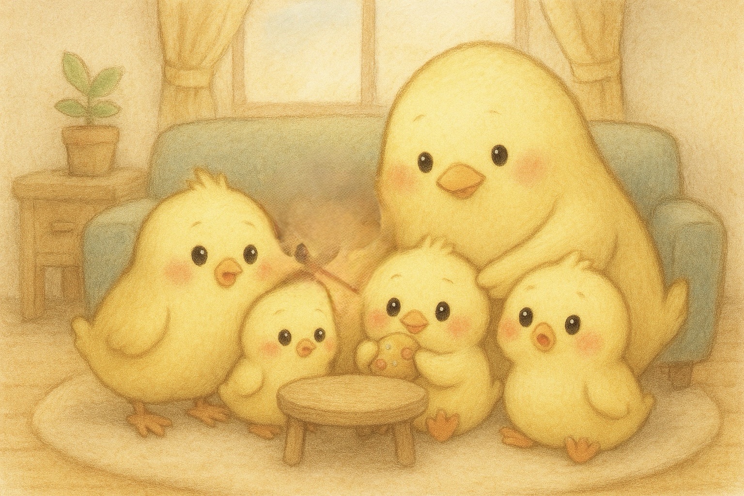 それからしばらくして、忙しい日々が過ぎていきました。ヒヨコパパは相変わらず海外出張が続き、家には帰れない日が続いていましたが、三兄弟は、ヒヨコママが作ってくれるおいしいごはんを食べ、一緒にお絵かきをしたり、お昼寝をしたりして過ごしながら、あの楽しかったキャンプの思い出を胸に抱いていたのです。