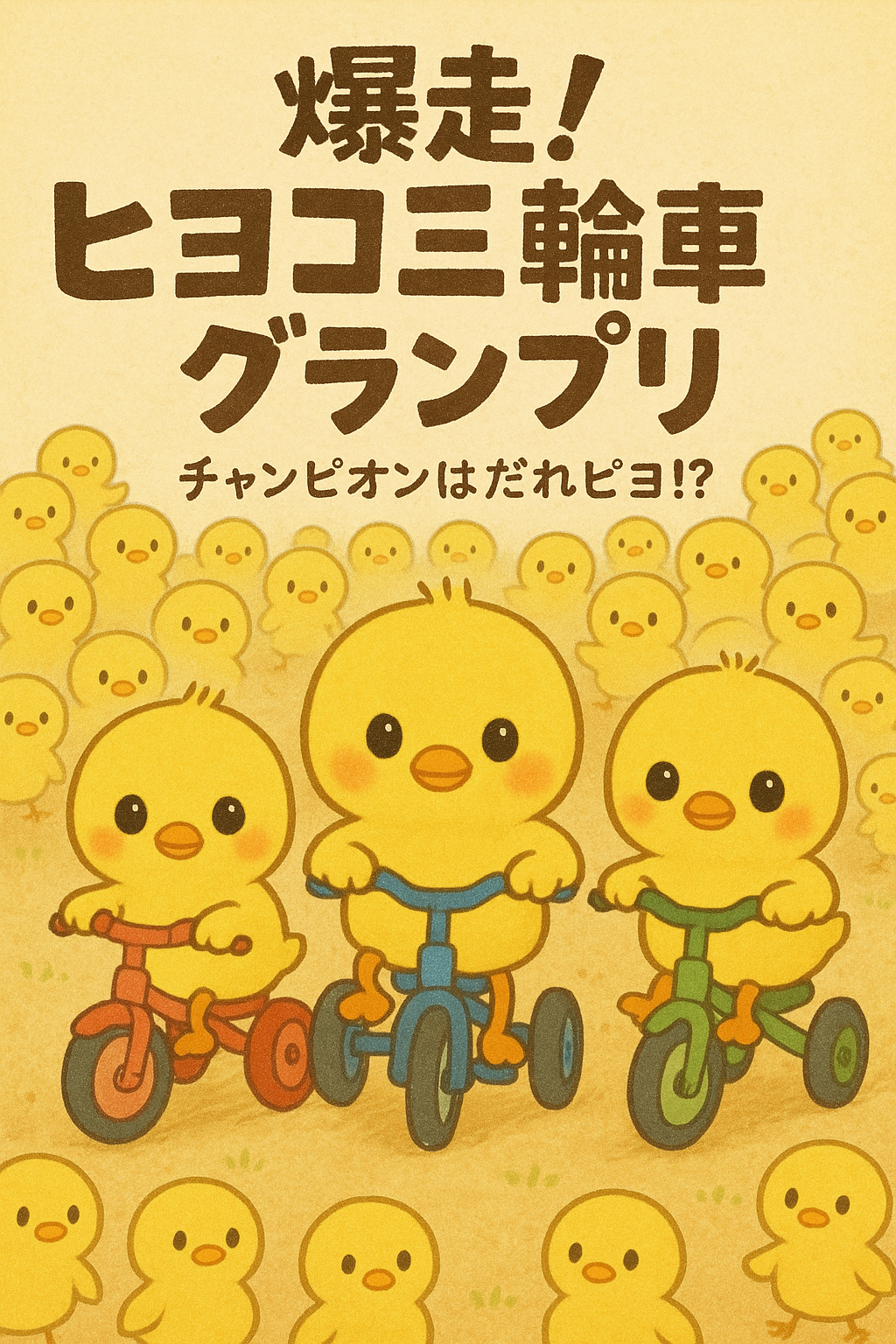 中央に三輪車に乗った3羽のかわいいヒヨコ三兄弟が並んで走っていて、左から赤い三輪車、青い三輪車、緑の三輪車に乗っています。背景にはたくさんのひよこたちが応援しているように描かれています。上部には大きな文字で「爆走!ヒヨコミ三輪車グランプリ」と書かれており、その下に「チャンピオンはだれピヨ!?」と書かれています。