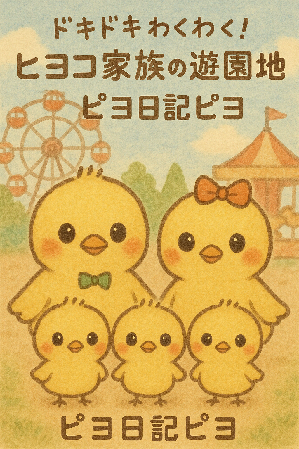 イラストの上部には「ドキドキわくわく!ヒヨコ家族の遊園地 ピヨ日記ピヨ」と書かれており、下部にも「ピヨ日記ピヨ」と書かれています。