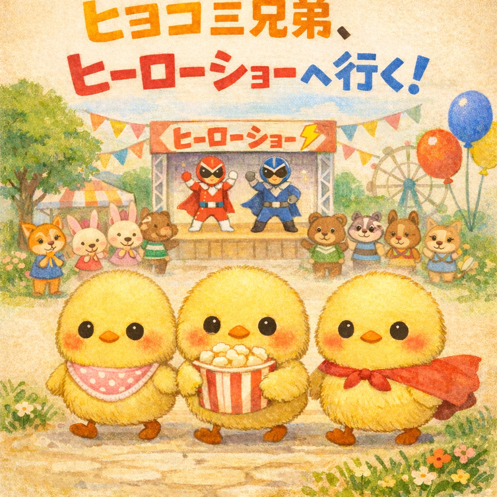 ヒヨコ三兄弟が、わくわくしながらヒーローショーへ向かっているピヨ!