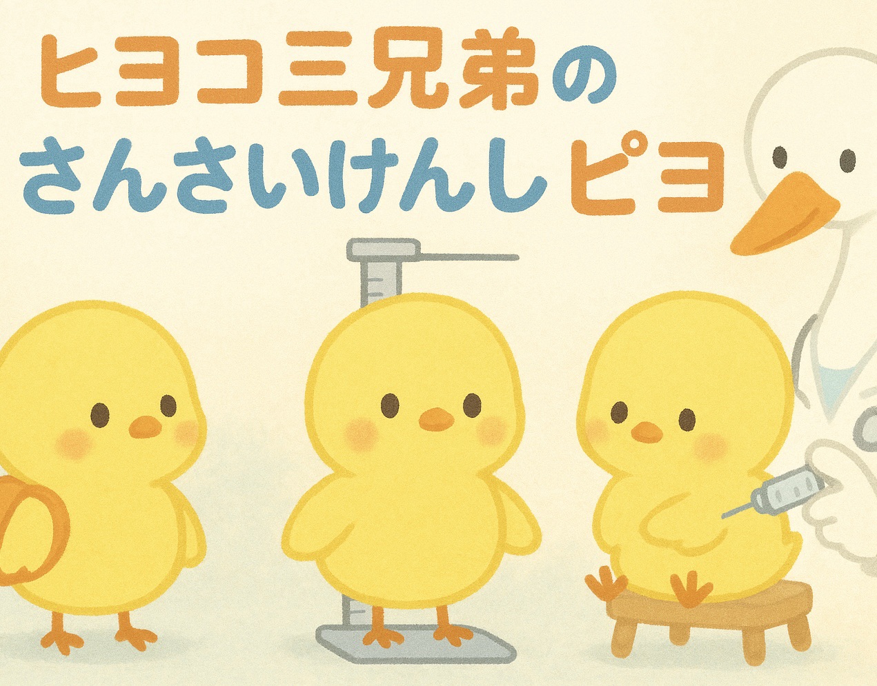 ※タイトルのイラストはひだりからリュックピヨコ、しんちょうはかってるピヨコ、ちゅうしゃうたれているピヨコがいるピヨ。みぎにおいしゃさんのとりがいて、ちゅうしゃしてるピヨ。うえには「ヒヨコ三兄弟のさんさいけんしピヨ」ってかいてあるピヨ。ぜんたいにほのぼのしてるピヨ。
