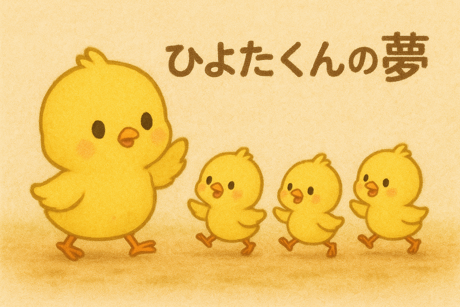 ひよたくんが、小さなヒヨコたちに鬼ごっこを教えているイラスト。ちっちゃなヒヨコたちに優しく教えてあげています。イラストにはひよたくんの夢という文字が書かれています。